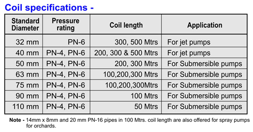 We also offer PE pipes for lowering submersible pumps. As it is free of.any joints the installation is very easy and fast. These pipes are made as per IS4984 and the product details are given below.